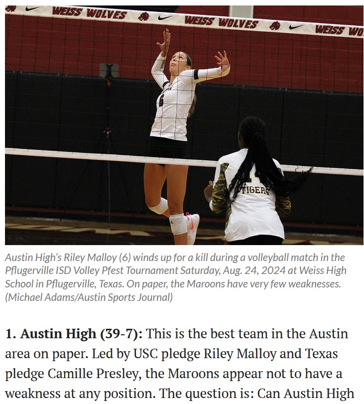 The Austin High Maroons volleyball team has been selected by the Austin Sports Journal as the #1 team in the area heading into the 2025 season. The ASJ’s Michael Adams, an expert on volleyball in this area, ranks Austin High ahead of every other team in Central Texas including Drip, LT, Vandegrift & Westlake. This is coming on the heels of a 2024 where the Lady Maroons spent a majority of the season in the top 10 in the State in UIL 6A classification. Austin High returns a lot of those talented players for ’25 and has developed more talent in the Maroons program than likely ever in the 144 year history of Austin High. The Maroons are led this season by Senior Riley Malloy (USC volleyball commit) and Junior Camille Presley (Texas volleyball commit). The Austin High Varsity Head Coach is Kiley Woods.