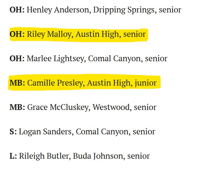 In addition to the lofty team ranking bestowed by the Sports Journal, there were two Austin High standouts named to the prestigious All Area team in 6A: Malloy & Presley. See full list below: